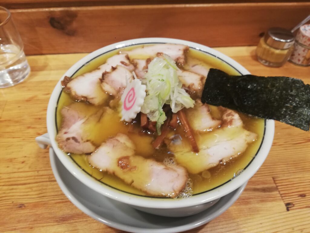 さて、肝心のラーメンについて語ろう。見た目は薄そうなスープだが、一口飲むとその濃厚さに驚かされるのだ。これは、鶏ガラと魚介のダブルスープで、深みのある味わいが特徴なのだ。麺は中太のストレート麺で、スープとよく絡む。そして、末広がりにちりばめられたチャーシューが絶品なのだ。脂身と赤身のバランスが絶妙で、一口食べるとその柔らかさと旨みに感動するのだ。