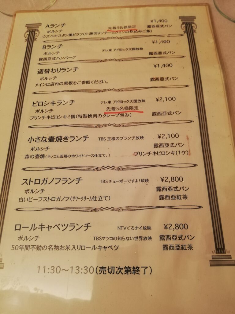 やがて扉が開き、店内へ。並んでいた客たちは、一目散にピロシキのランチセットを注文している。吾輩は、その光景を横目に、ただ静かに奥の席を目指した。