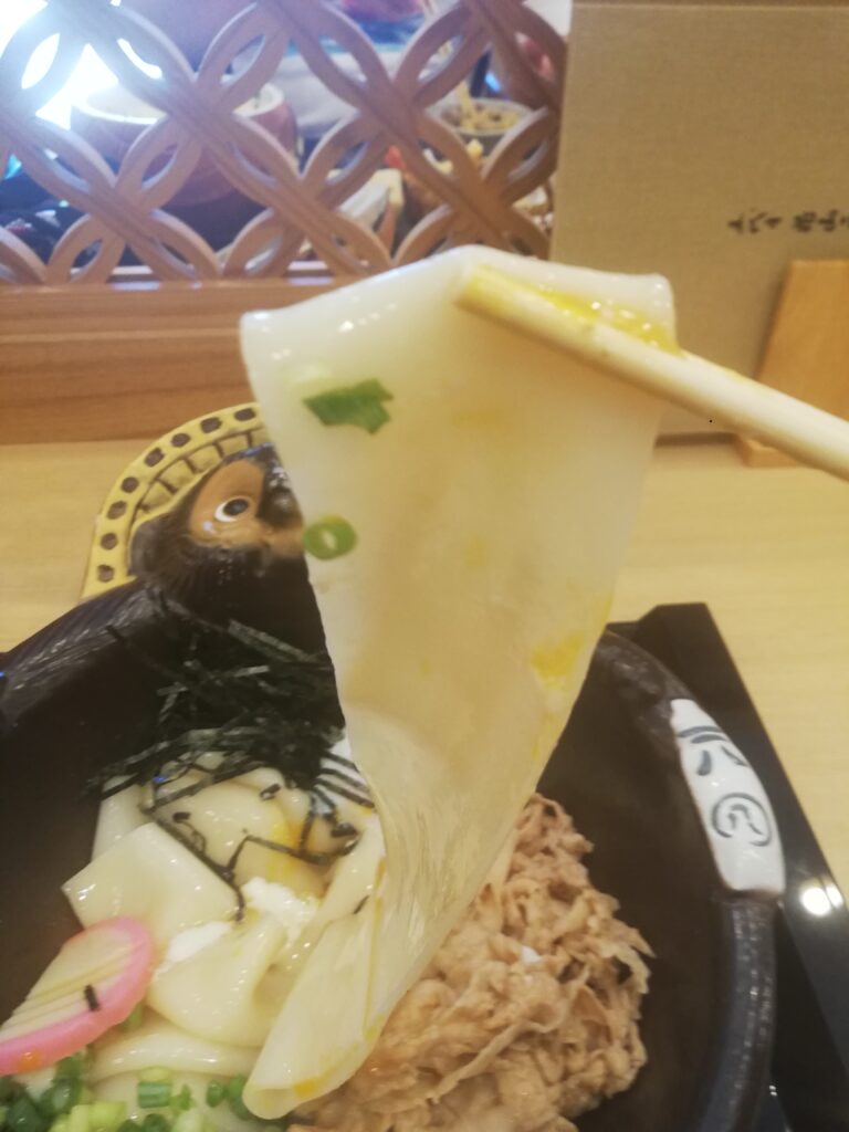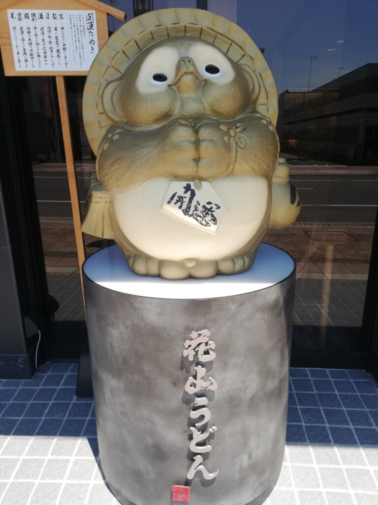…しかし、目の前に置かれたその姿は、吾輩の想像をはるかに超えていた。直径20cmはあろうかという、狸の形をした大きな器に、きしめんの幅をはるかに超える、幅5cm以上の平たい麺が、美しく盛り付けられている。まさしく、その存在感は「ドーン」という擬音がふさわしい。