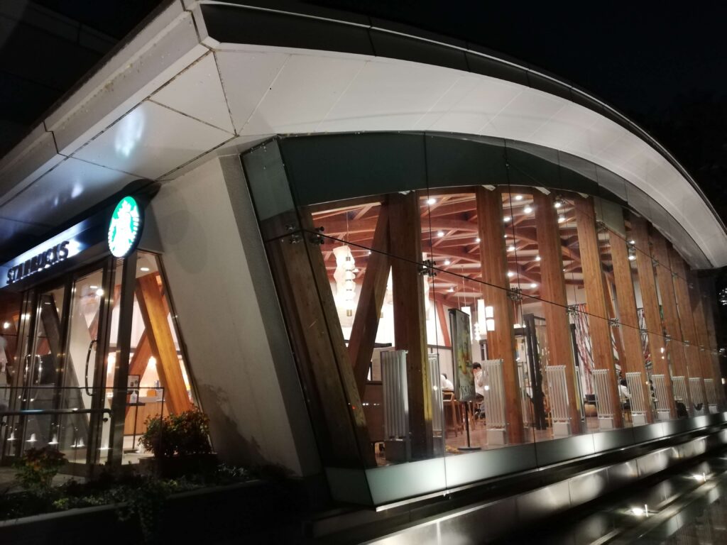 店舗の正面に回って、その佇まいに圧倒された。これは間違いなく、都内スタバの中のオシャレの最高位にある店舗だと言って間違いないだろう。いや、全てのスタバに足を運んだわけではないが、きっとまちがいないだろう。三つのアーチが連なる屋根は、どことなくオーストラリアのオペラハウスを思わせる優美な曲線美。建築というものが単なる機能ではなく、芸術であることを再認識させられる。いろいろ書いたがオーストラリア、、、もちろん行ったことなどない。