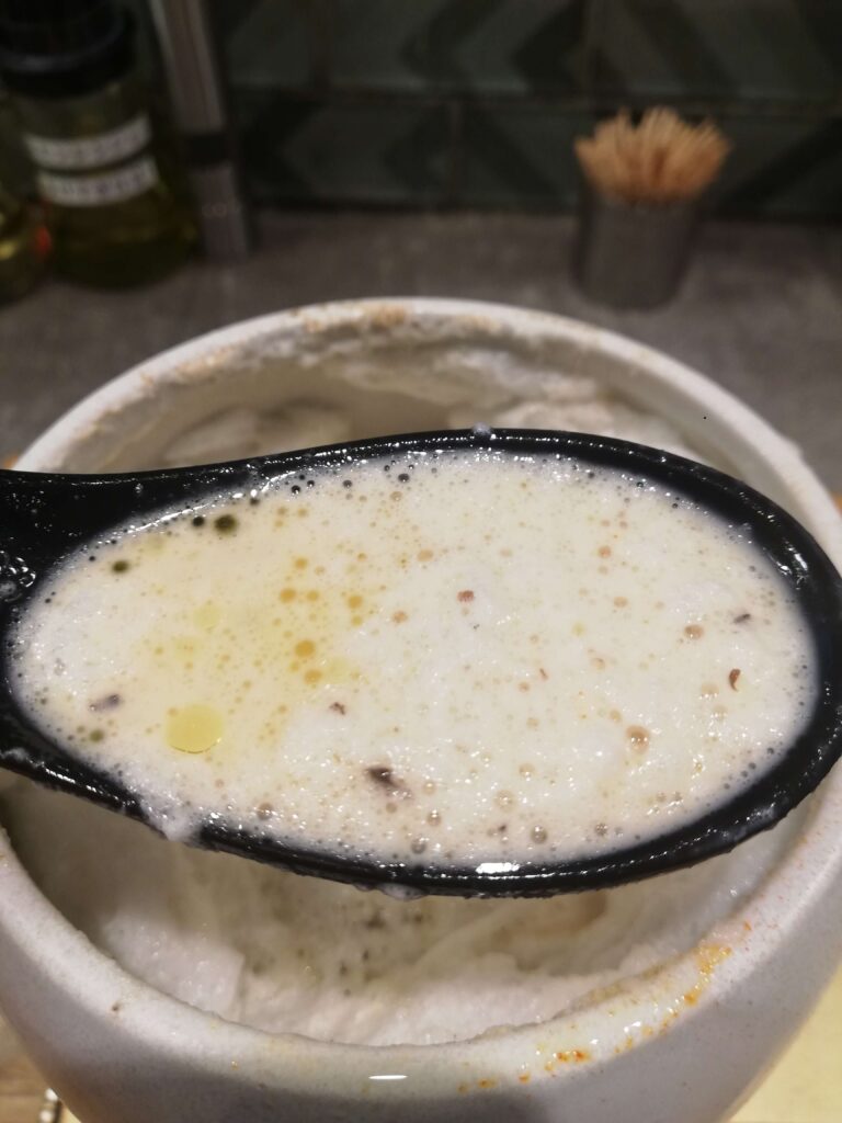 附属にオリーブオイルのようなものがある。店員の指示に従い、それをメレンゲの上に垂らしてみる。すると液体はゆっくりとメレンゲの上をこぼれ落ち、お皿にこぼれる。まるで時間がスローモーションになったかのような光景だ。これは食事というより、一種のパフォーマンスである。