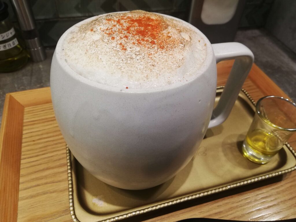目の前に現れたのは、どう見てもカフェで出てくるカプチーノである。大きめのマグカップに、ふわふわのメレンゲが雲のように乗っている。これが「ラーメン」と呼ばれることに、吾輩は一瞬戸惑いを覚えた。