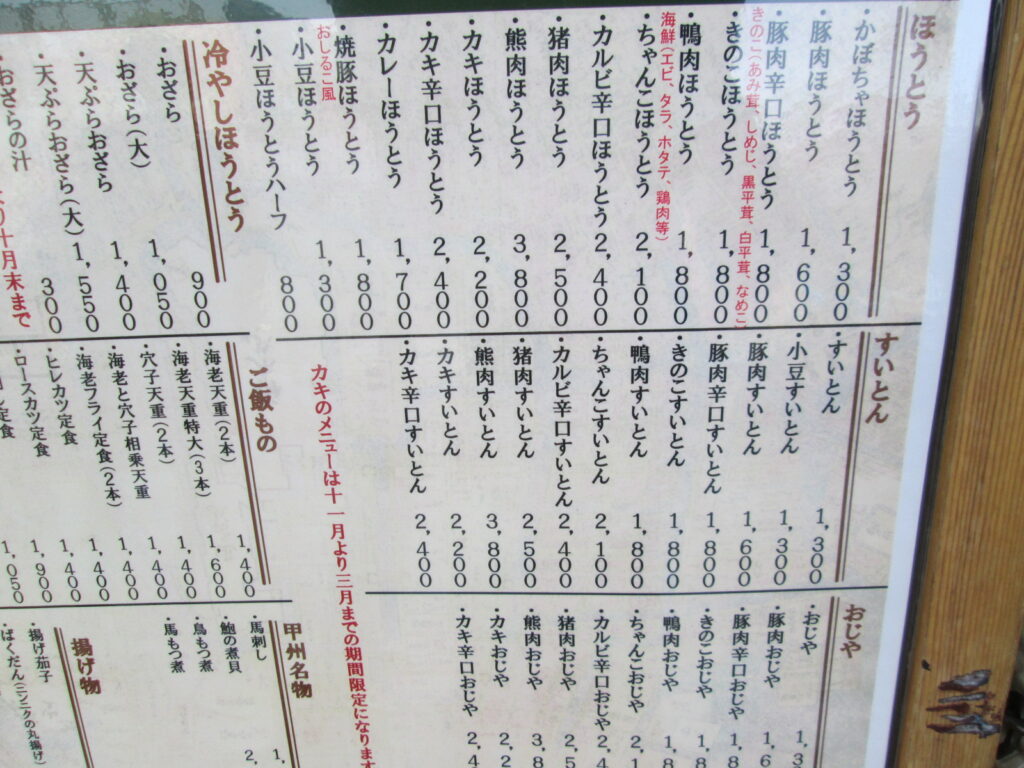 この店「小作」は、武田信玄の時代から甲州の魂を育んできたほうとうという郷土の盾を掲げる名店だ。 ここで少し、歴史の講義をしておこう。ほうとうの起源は、平安時代の**「饂飩(はくたく)」にまで遡るという。これは小麦粉を練って平たくしたもので、貴族の儀式食であったらしい。それが時を経て、戦国の世に信玄公が野戦における兵糧として用いたことで、甲斐の国に定着したとされる。生麺をそのまま野菜と共に味噌で煮込むこの料理は、手間がかからず栄養価が高い。まさに山梨の歴史そのものが味噌で煮込まれた文化的化石**であり、効率化の極致たる「ファストフード」の元祖とも言えるだろう。