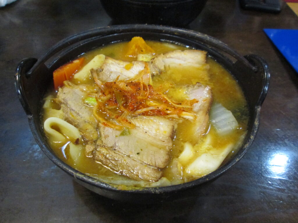 眼前に置かれたのは、一人前とは思えない巨大な鉄鍋である。 グツグツと煮えたぎる鉄鍋は、まるで火山の火口のよう。マグマのようにボコボコと泡立つ味噌スープ。その中から、湯気とともに濃厚な香りが立ち上り、吾輩の鼻腔(牛の嗅覚は鋭いのだ)を強襲する。 幅広の麺とゴロゴロと乱雑に入った野菜。巨大なカボチャ、ジャガイモ、里芋、人参、ゴボウ、椎茸、山菜。そしてそれらを統率する主役、豚肉の脂が、全てを優しく包む味噌に溶け合う。