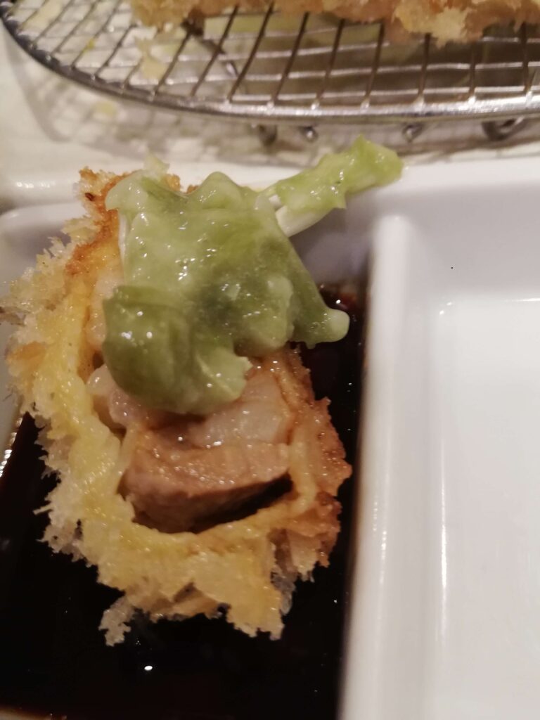 うむ、実に見事な醤油とわさびのアンサンブルであった。この様なトンカツは食したことがないので、いたく感動する次第である