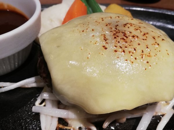 立ち上る湯気、芳醇な肉の香りの暴力。鉄板の上で、ソースが歓喜の声を上げている。デミグラスソースの深い茶色と、溶けたチーズの黄金色が、ハンバーグの表面で見事なコントラストを描いている。これはもはや、料理ではなく、一つの「作品」だ。