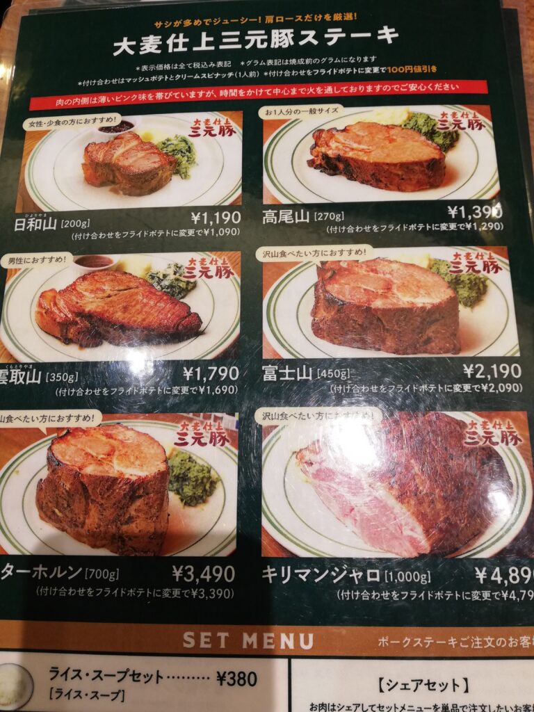 宮城の日和山(100g)から始まり、高尾山(270g)、雲取山(370g)……さらにはマッターホルン(570g)やマッキンリー(770g)、そして最高峰のエベレスト(970g)まで。肉の重量を山の標高になぞらえるという、この壮大なメタファー。