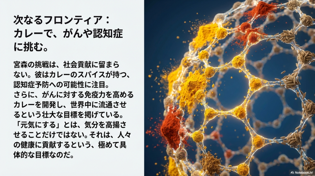 そして、ガンと戦うカレーでノーベル平和賞という夢。これは決して荒唐無稽な話ではない。カレーのスパイスには、科学的に証明された健康効果がある。それを極限まで高めることができれば、本当にガンと戦える食品になるかもしれない。そしてそれが実現すれば、世界中の多くの人々が救われるのだ。