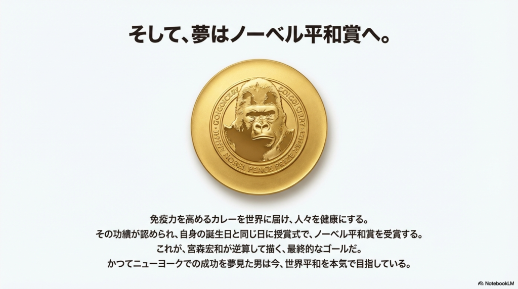 吾輩も本書の最後の章まで読み進めた。そこには宮森氏の究極の夢が記されていた。「ガンと戦うカレーをつくって、55歳でノーベル平和賞を受賞すること」――多くの人間は、これを誇大妄想と笑うかもしれない。しかし吾輩は、宮森氏が本気であることを知っている。
