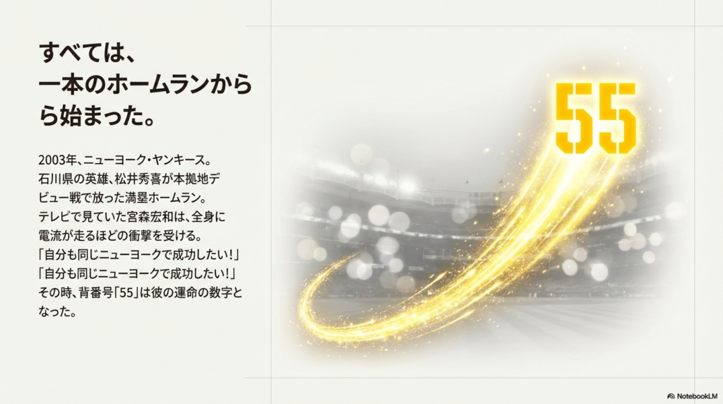 吾輩は思った。これは主人と同じではないか。主人もまた、ごく普通の家庭に生まれ、ごく普通の会社に勤める、ごく普通の人間である。しかし、宮森氏は29歳の時、大きな決断をした。松井秀喜選手がニューヨークのヤンキースタジアム開幕戦で打った満塁ホームランに感銘を受け、脱サラを決意し、裸一貫で上京したのである。
