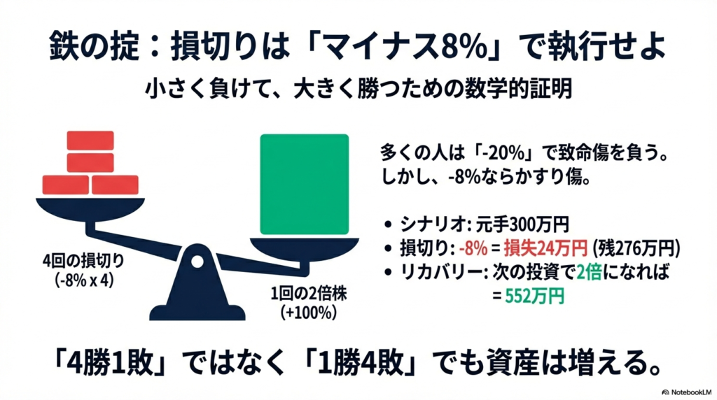 なぜ8%か?それは統計と経験に基づく。8%を超えて下がった株は、そのまま下落し続ける確率が高い。ならば、早めに切って、次の投資に回した方が良い